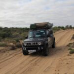 De camping is alleen toegankelijk over een weg met diep duinzand. Alleen geschikt voor 4 wheeldrive voertuigen en het is verplicht de banden leeg te laten lopen tot een druk van 1,2 bar. Daar wordt door de Parkleiding op toegezien. Waarschijnlijk hebben ze veel moeite om alle gestrande toeristen weer vlot te trekken. Onze Jimny had op sommige plekken moeite door het zand te komen, maar vooral het hoge zwaartepunt door de daktent zorgt voor onverwachtse schommelingen over dwars.