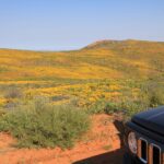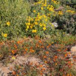 We hebben erg genoten van alle bloemetjes en veel soorten op de foto gezet. Natuurlijk hield de bloemenpracht niet op bij de grens van het park. Ook daarbuiten waren de berghellingen gekleurd in allerlei tinten. We rijden door zeer afgelegen gebieden en doen om de haverklap hekken van boerenerven open en passeren veeroosters. We hebben het gevoel onontdekt Afrika al binnen te zijn gegaan. We eindigen vandaag onze trip in Springbok, waar een camping, een supermarkt en een tankstation zijn, zodat we alle voorraden weer kunnen aanvullen.