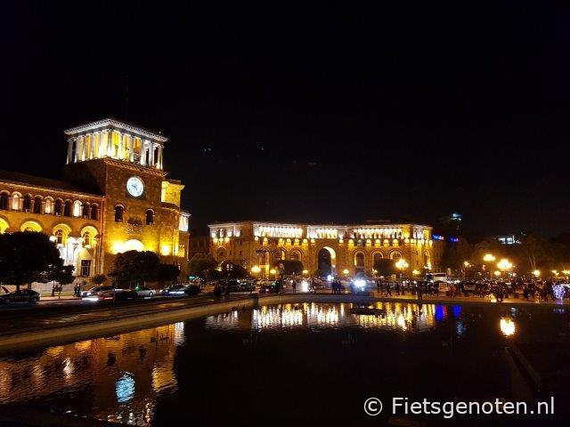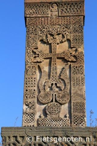 Aan het eind van de middag nemen we deel aan een Free Walking tour, waarbij een lokale gids ons mee neemt door de stad. De gids vertelt veel over de Armeense geschiedenis, de strijd met Turkije en de huidige oorlog met Azerbeidzjan. En over de drang van Armenië om zich te kunnen meten met Georgië. Zoals door het bouwen van een televisietoren, net een paar meter hoger dan de televisietoren in Georgië. Onderweg leidt de gids ons langs een Chatsjkar, een typisch Armeense gedenksteen. Een Chatsjkar is een verticale steen die versierd is met vlechtwerk met typische Armeense motieven, zoals de granaatappel en druiven. De druiven staan voor het bloed van Jezus en de granaatappel voor geluk en vruchtbaarheid. De granaatappel is tevens het nationale symbool van Armenië. Later op de reis komen we nog veel meer van deze Chatsjkars tegen, net als granaatappel(sap). Na de stadswandeling gaan we, samen met de rest van de rondleidingsgroep, in een typisch Armeens restaurant eten.